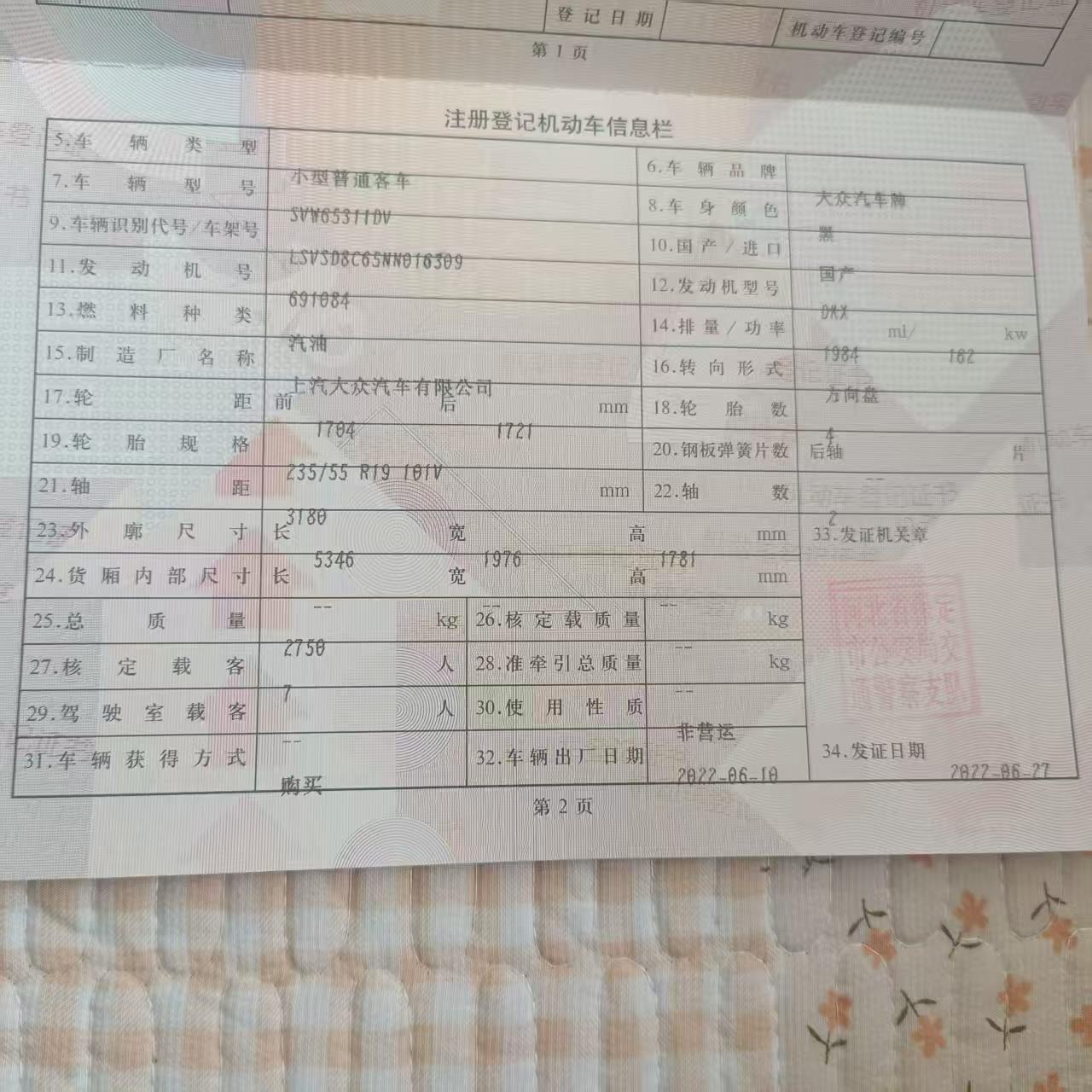 初次登记日期 2022-06-27 车辆名称 大众 威然