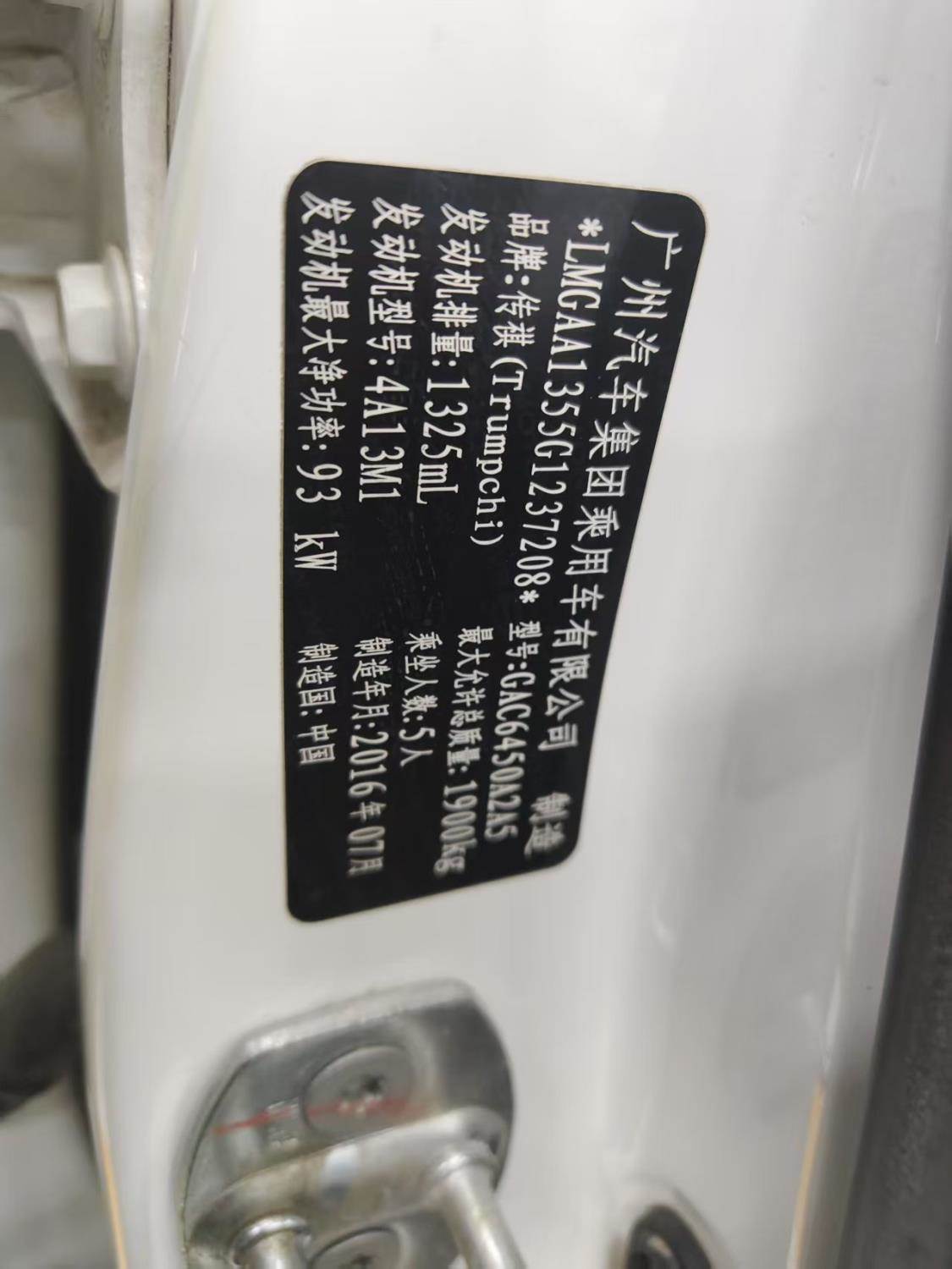 底盘号码 LMGAA1355G1237208 变速箱类型 手动