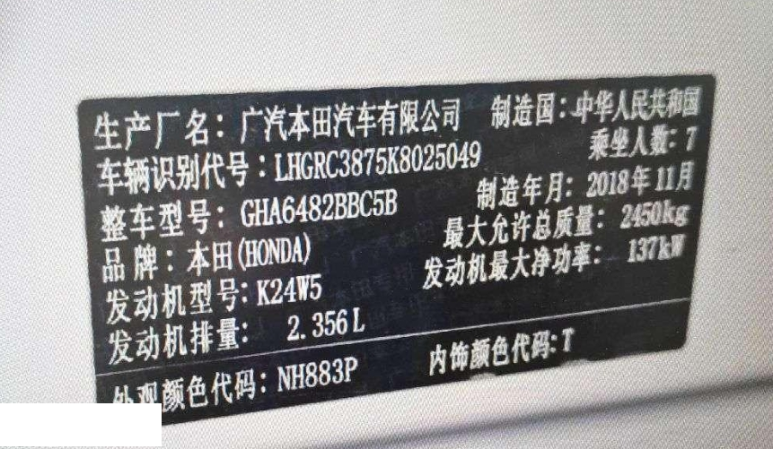 底盘号码 LHGRC3875K8025049 变速箱类型 自动