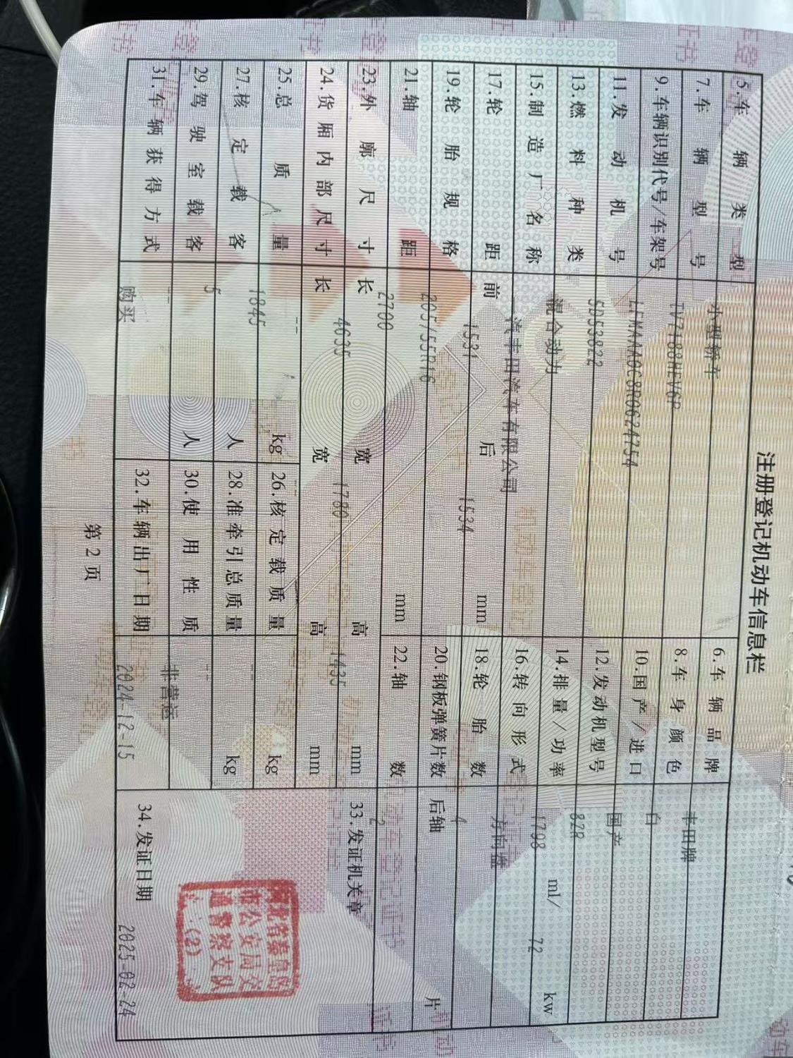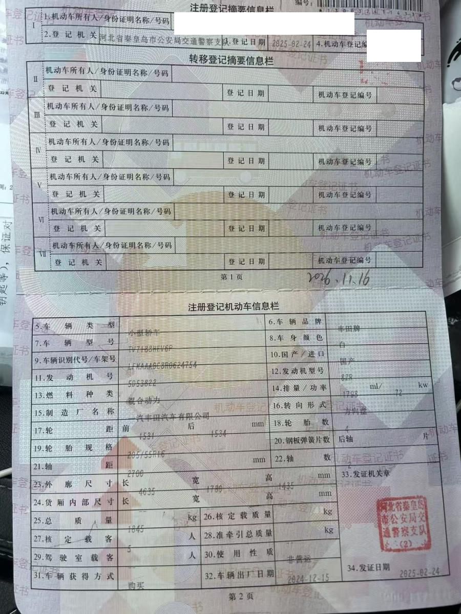 初次登记日期 2025-02-24 车辆名称 丰田 卡罗拉