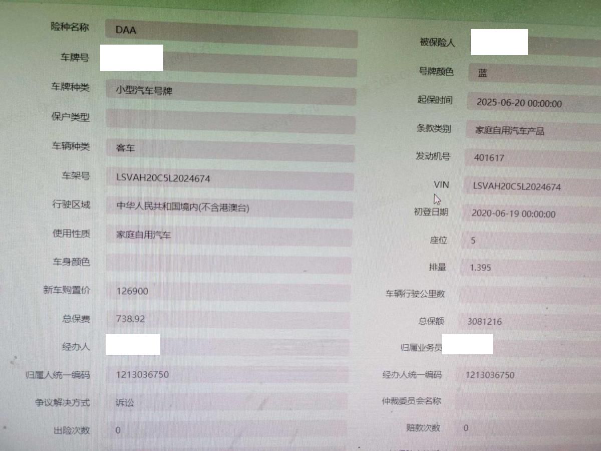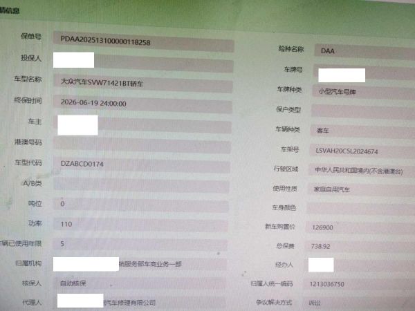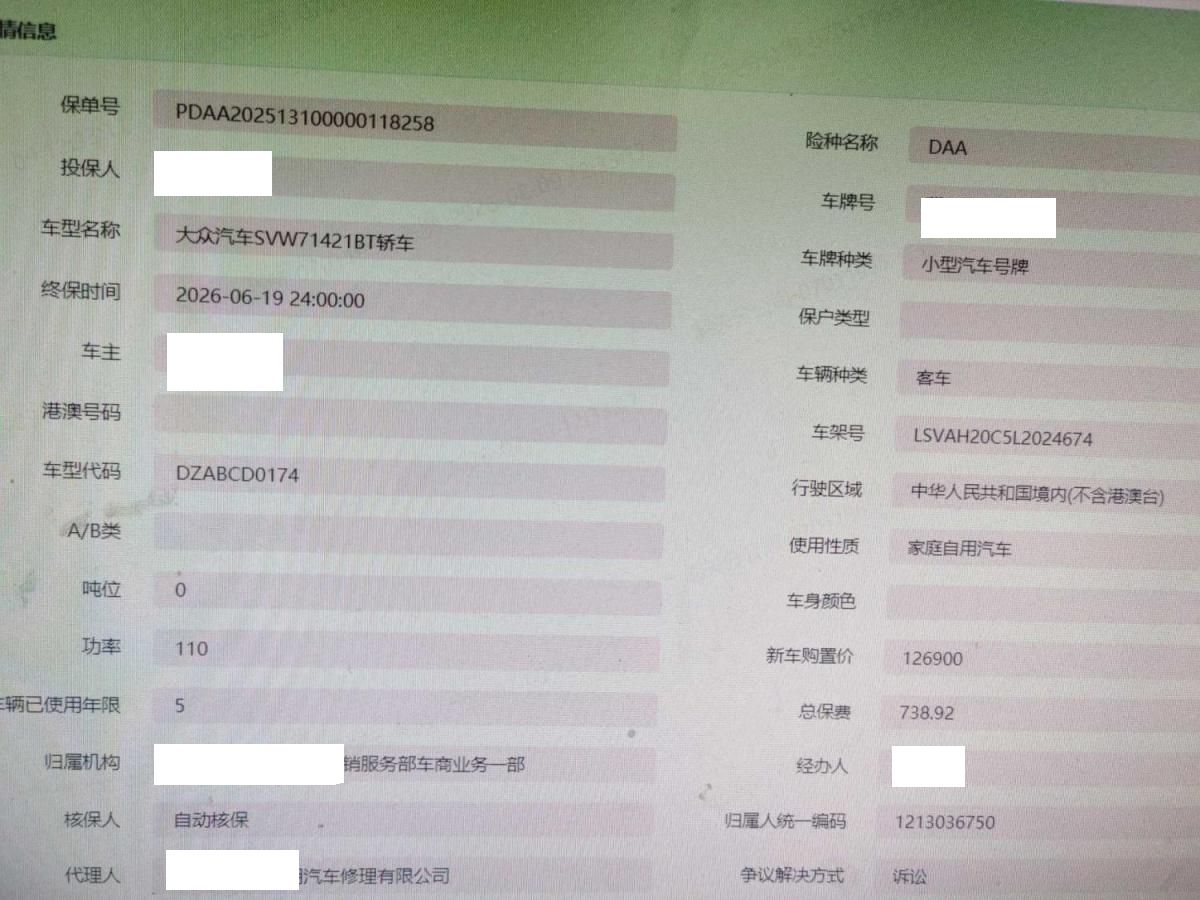 初次登记日期 2020-06-19 车辆名称 大众 朗逸