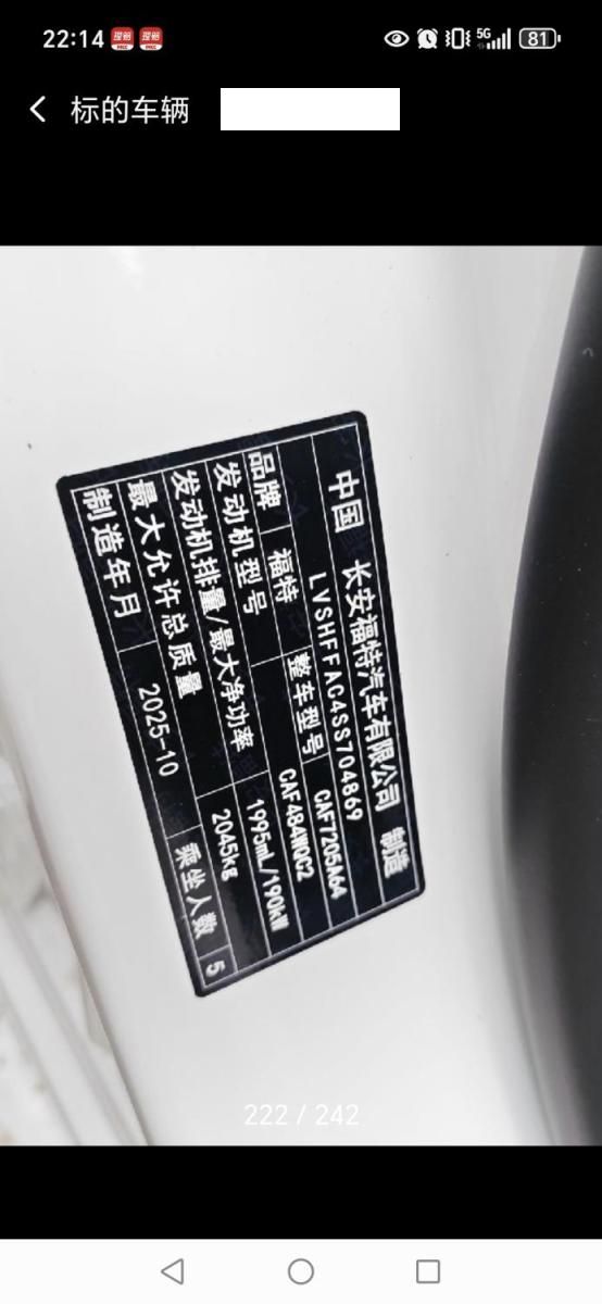 底盘号码 LVSHFFAC4SS704869 变速箱类型 自动
