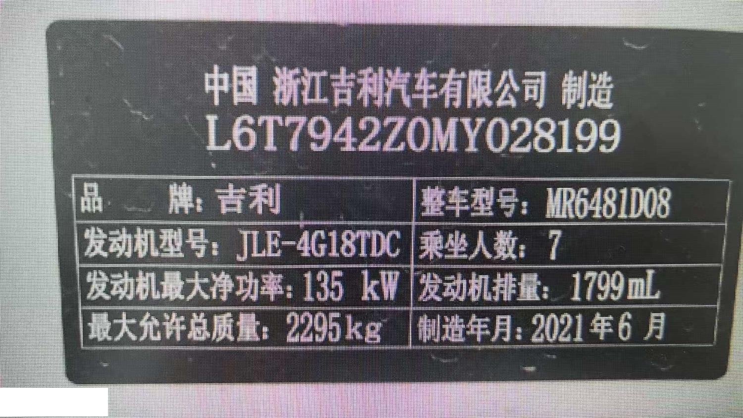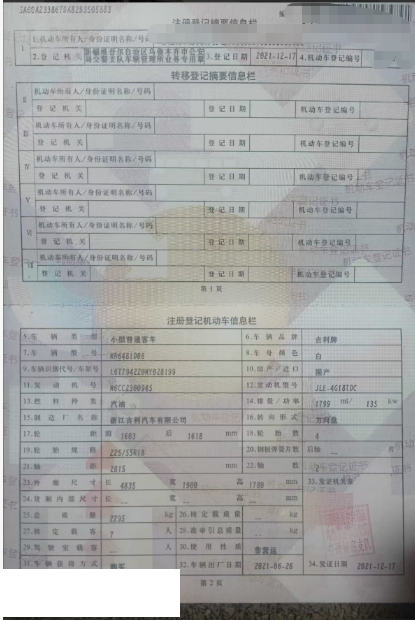 初次登记日期 2021-12-17 车辆名称 吉利汽车