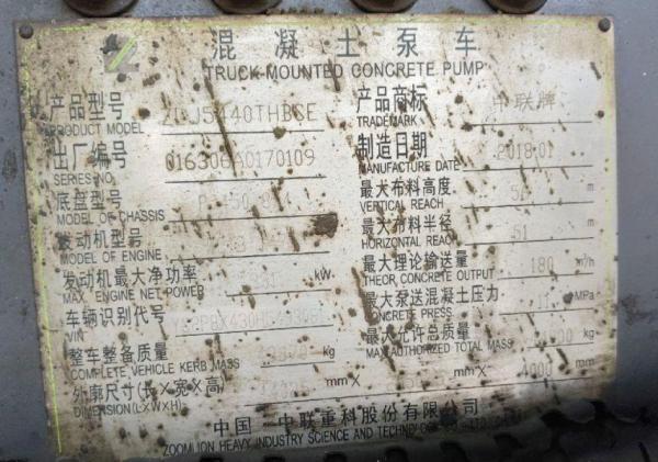 初次登记日期 2018-04-17 车辆名称 中联重工 中联混凝土泵车
