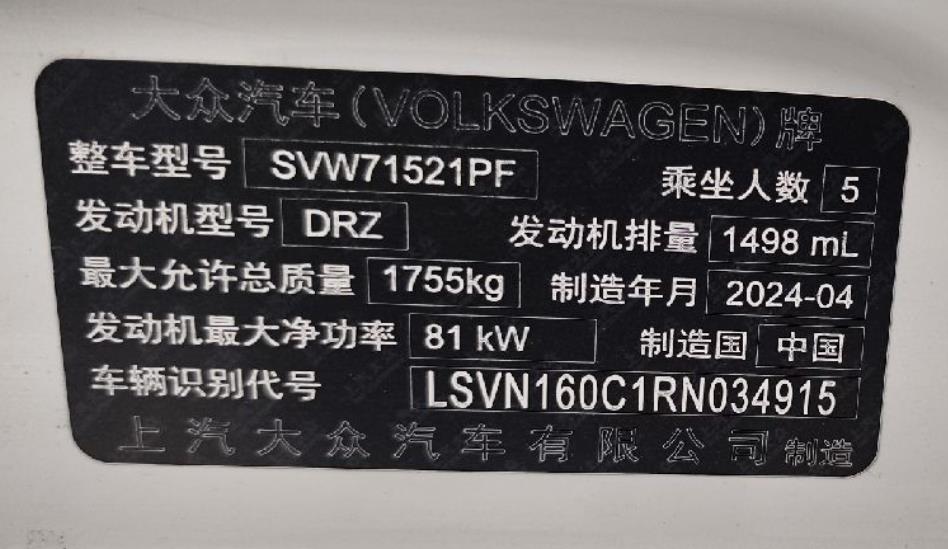 初次登记日期 2024-10-09 车辆名称 大众 朗逸