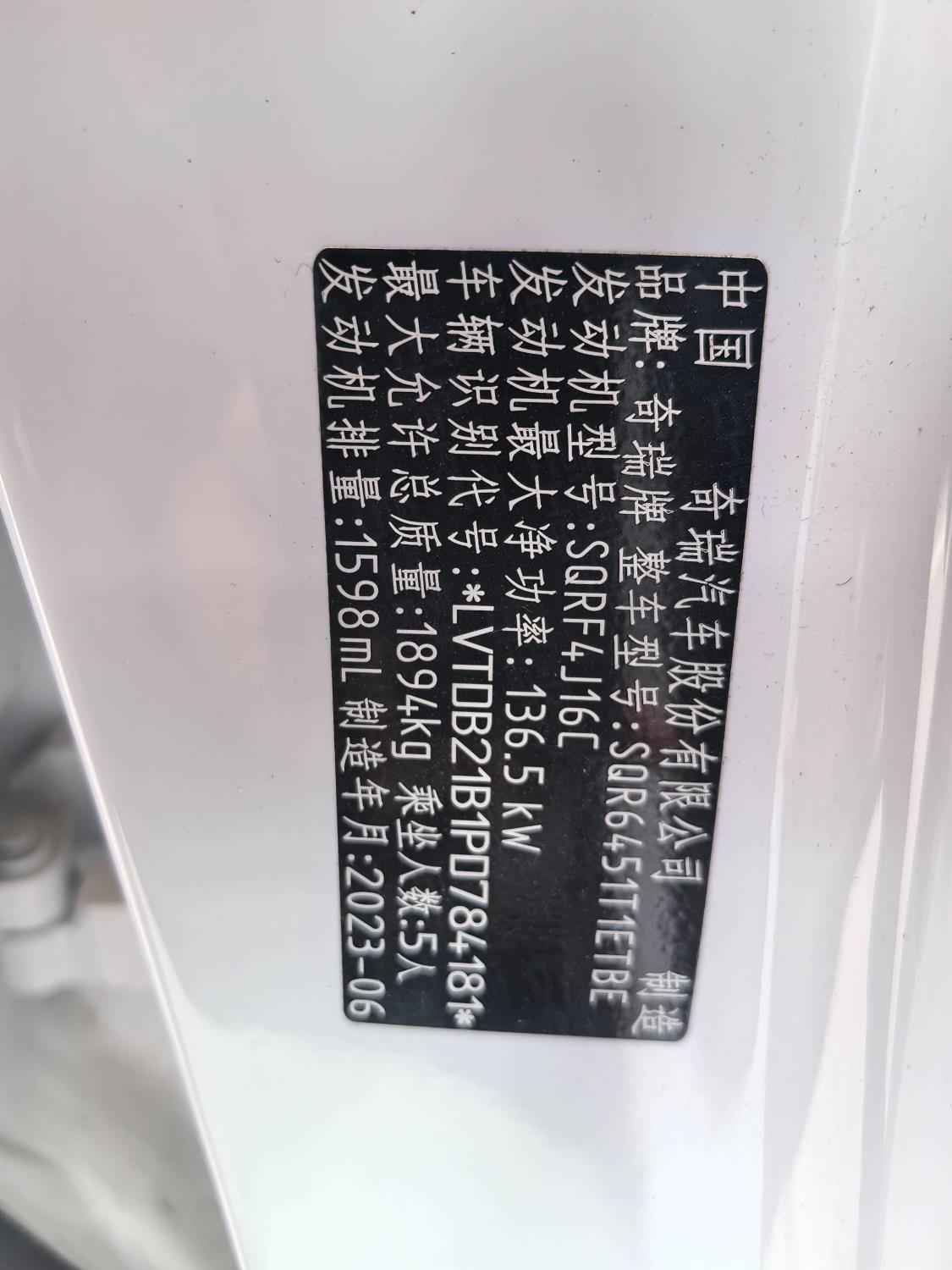 初次登记日期 2023-06-29 车辆名称 奇瑞 瑞虎7 PLUS