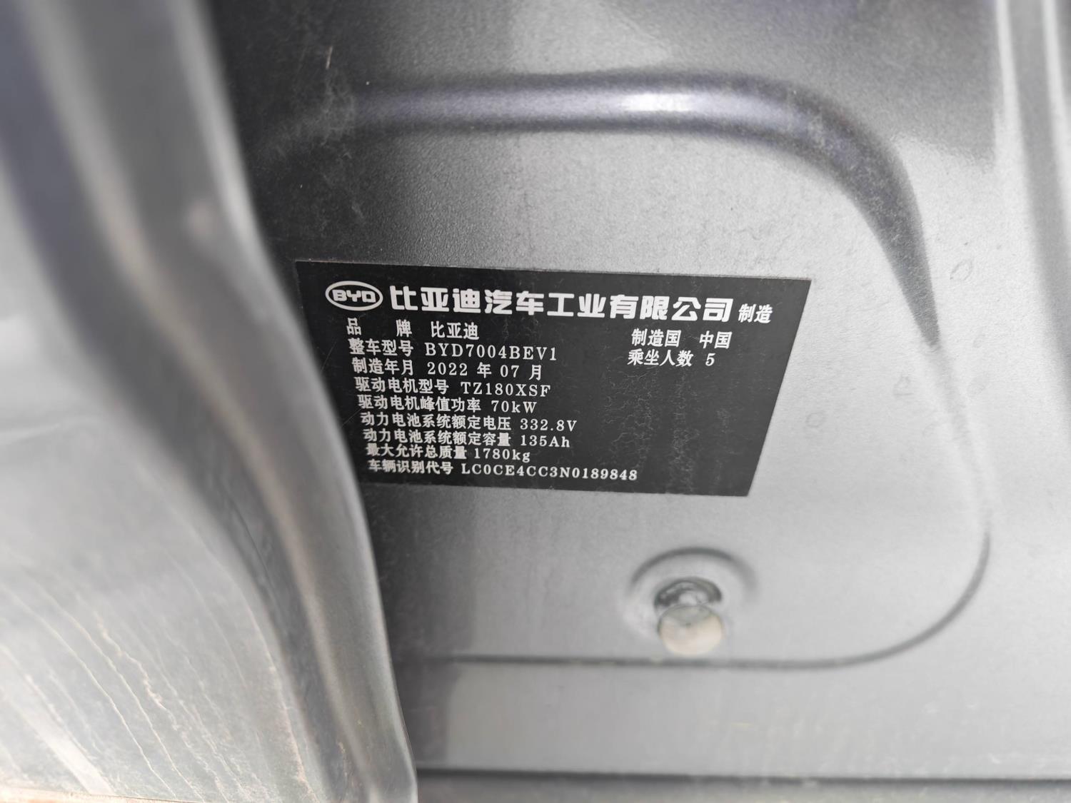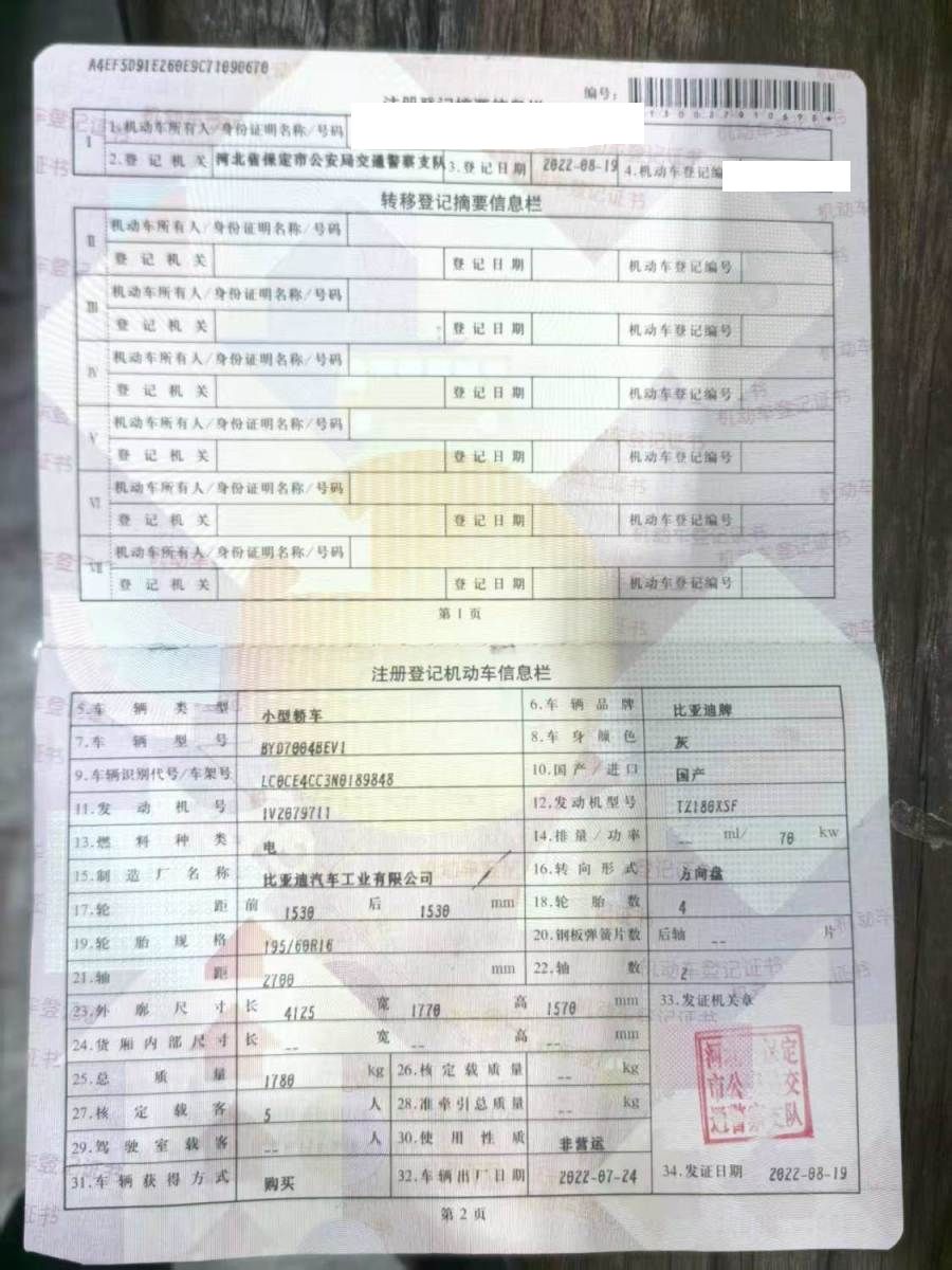 初次登记日期 2022-08-19 车辆名称 比亚迪 海豚