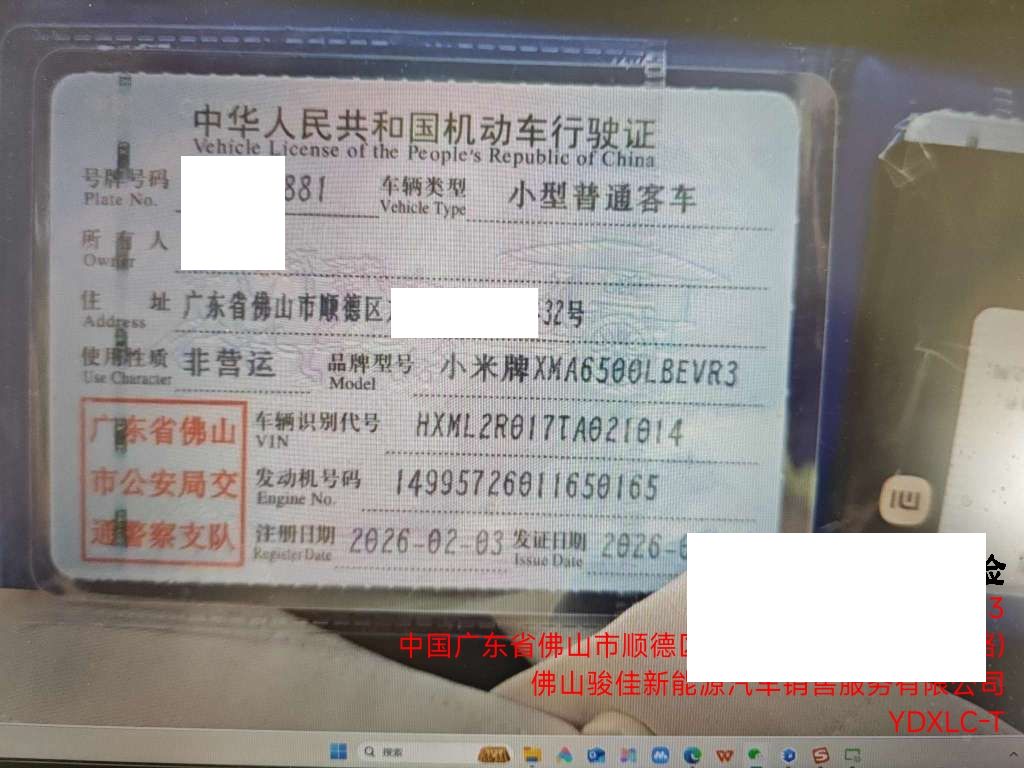 初次登记日期 2026-02-03 车辆名称 小米汽车