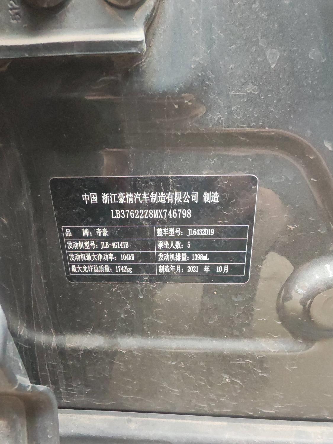 初次登记日期 2021-12-05 车辆名称 吉利汽车 缤越