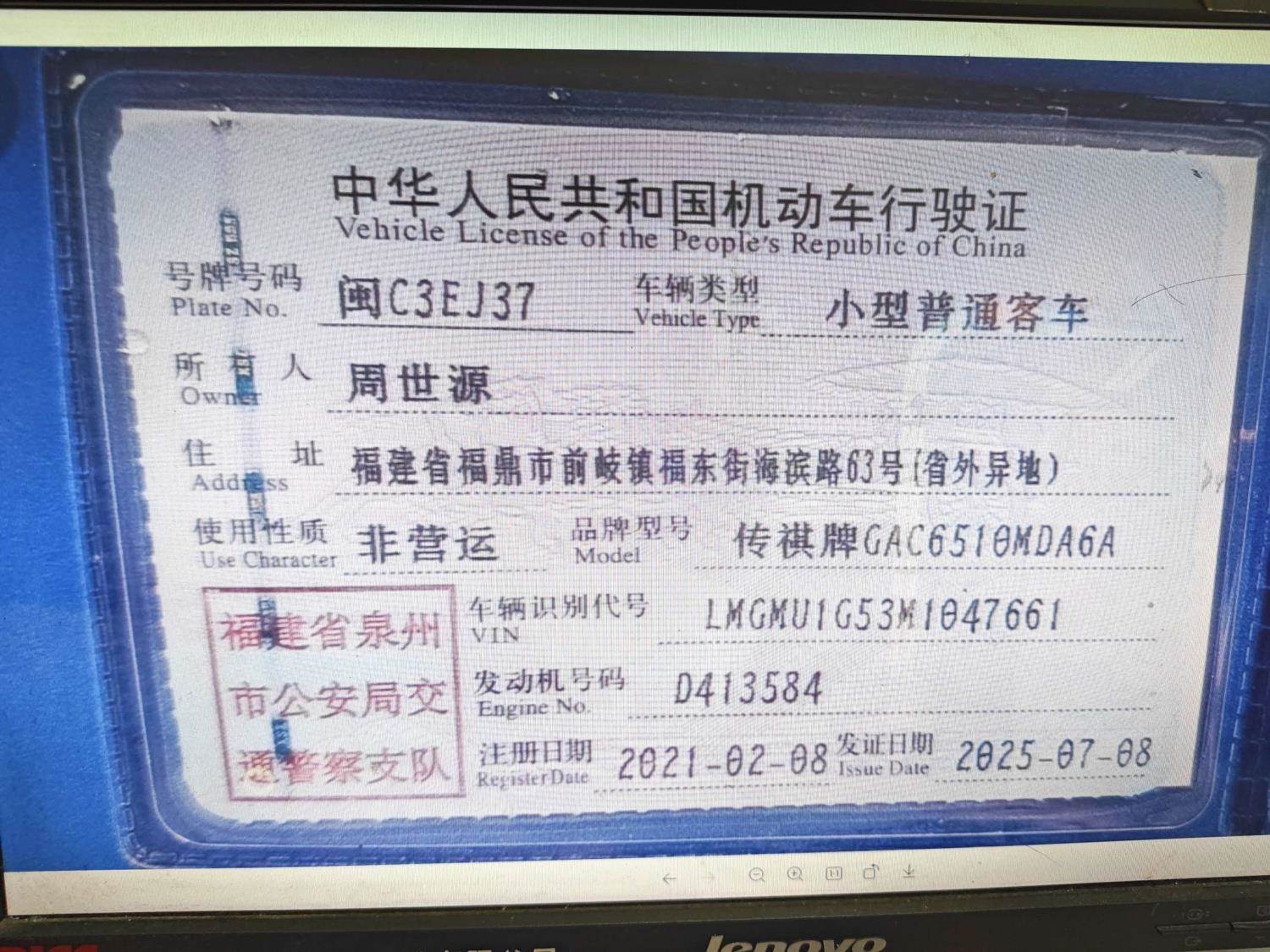 初次登记日期 2021-02-08 车辆名称 广汽传祺