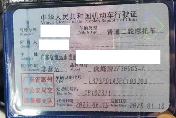 初次登记日期 2023-06-19 车辆名称 珠峰牌