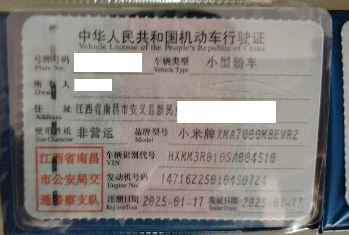 初次登记日期 2025-01-17 车辆名称 小米汽车 小米