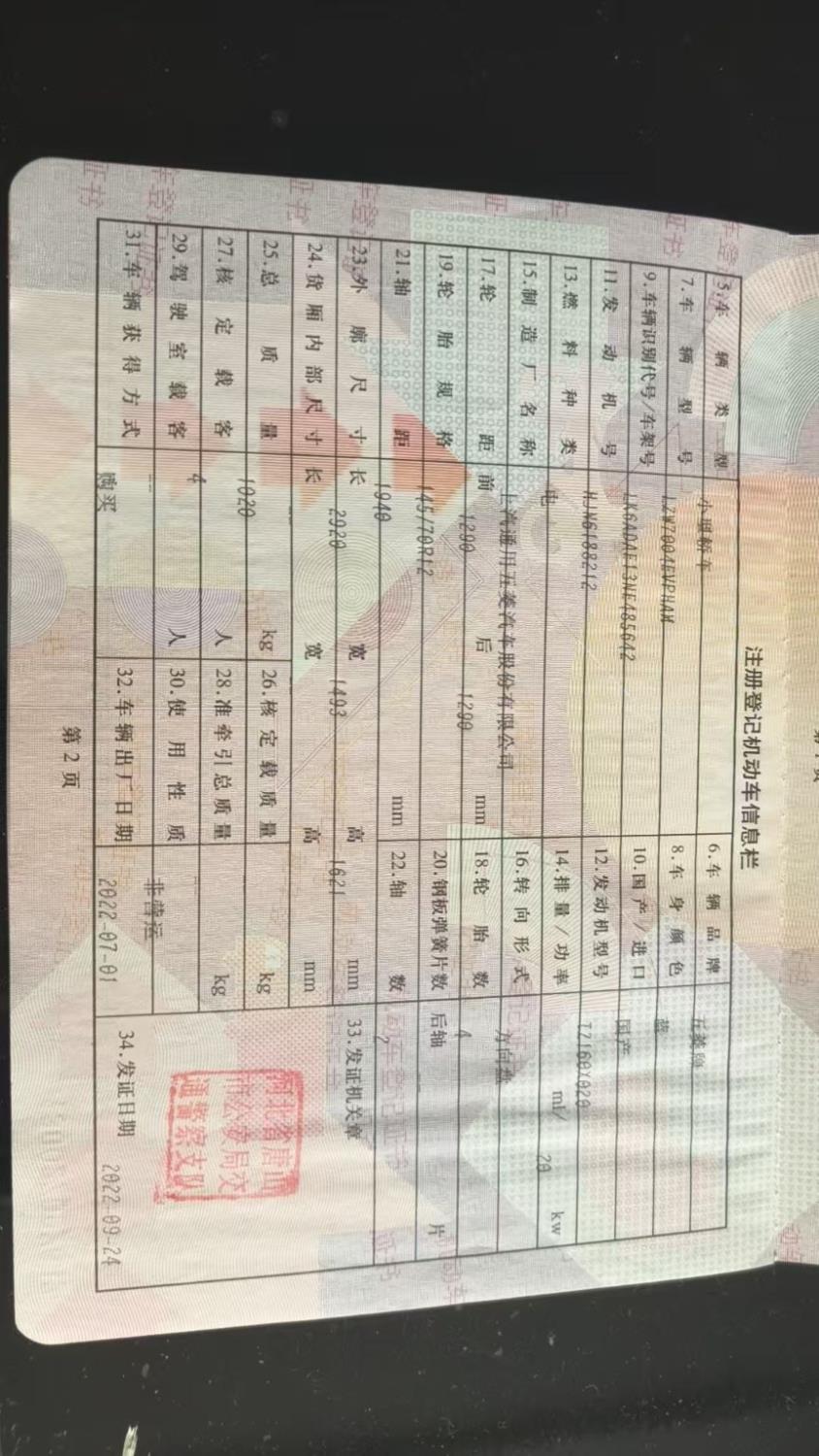 初次登记日期 2022-09-24 车辆名称 五菱汽车 宏光