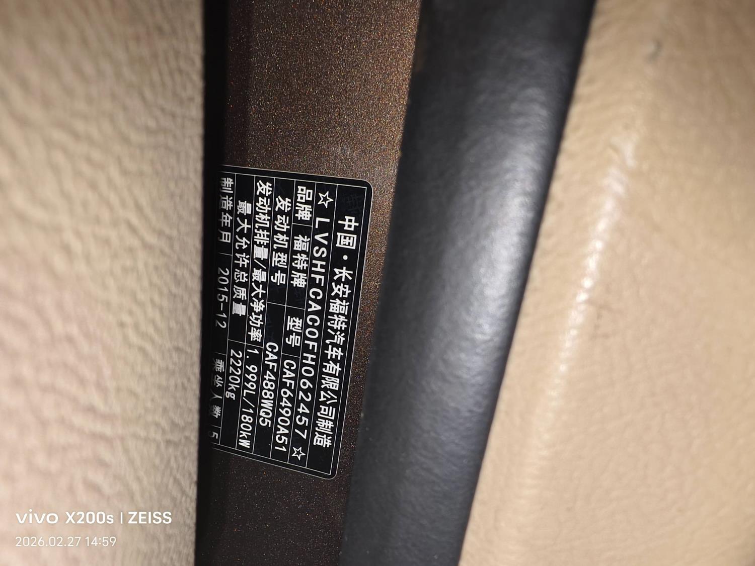 底盘号码 LVSHFCAC0FH062457 变速箱类型 手自一体