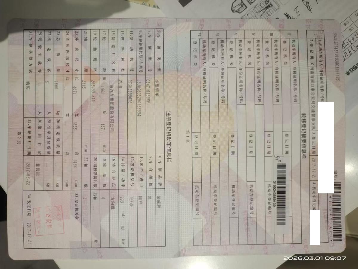 初次登记日期 2017-12-21 车辆名称 荣威i6经典