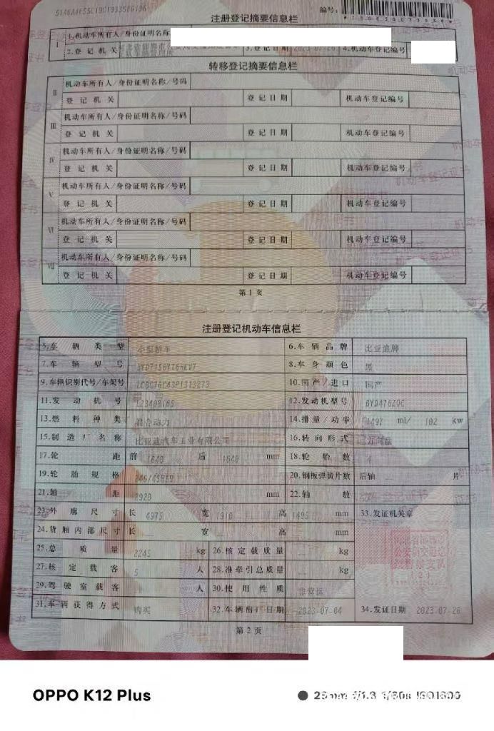初次登记日期 2023-07-26 车辆名称 比亚迪 汉