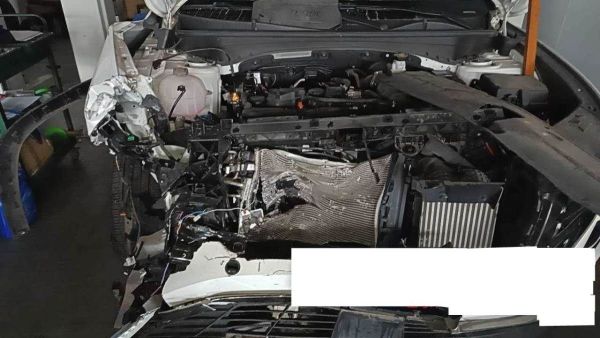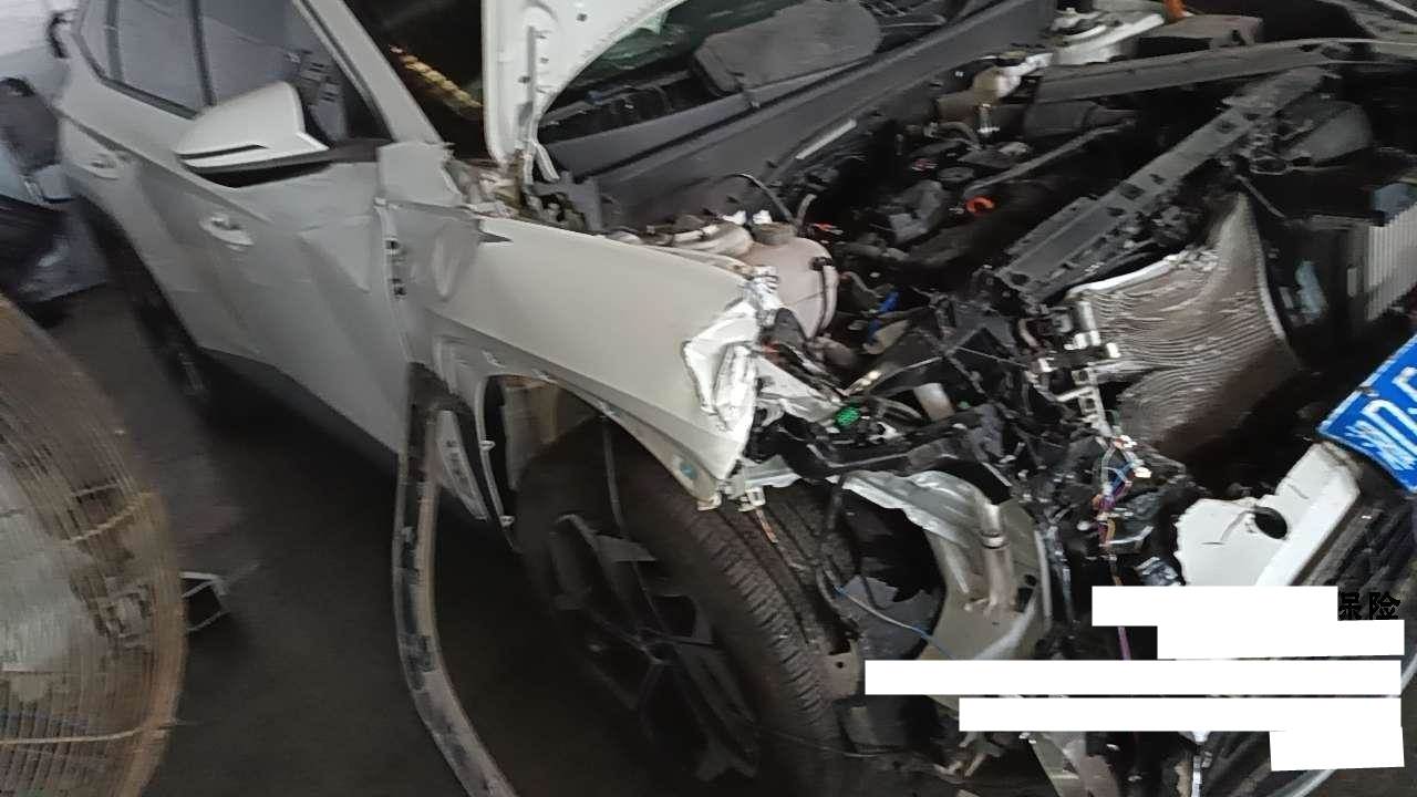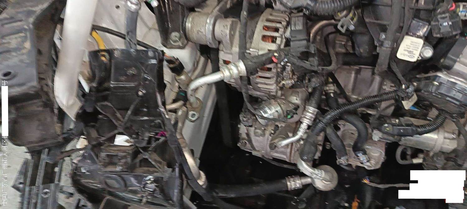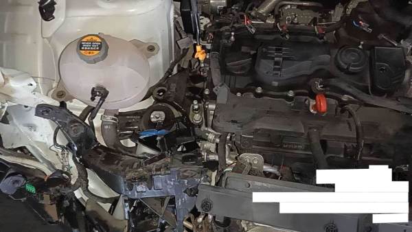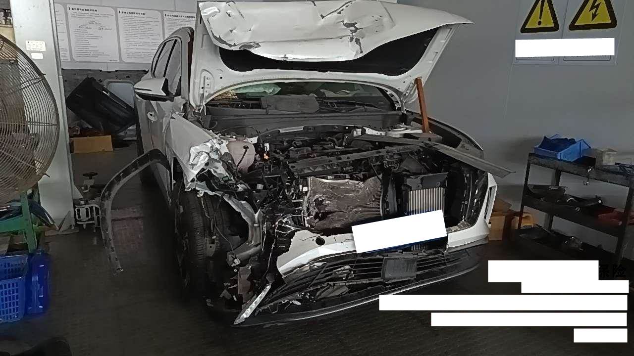 前部受损,爆气囊,右前纵梁变形,发动机后移(部分附件受损),已拆检,底盘隐损待定