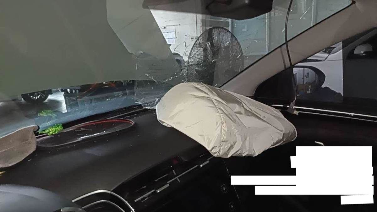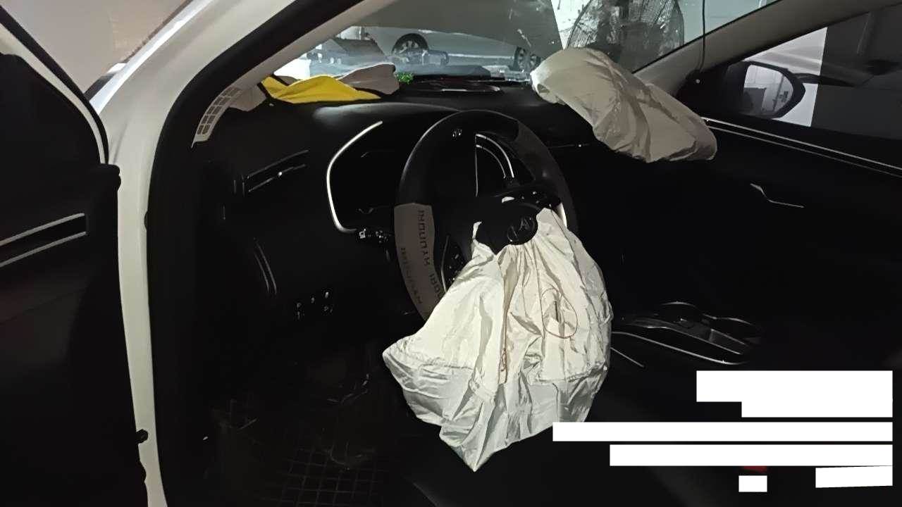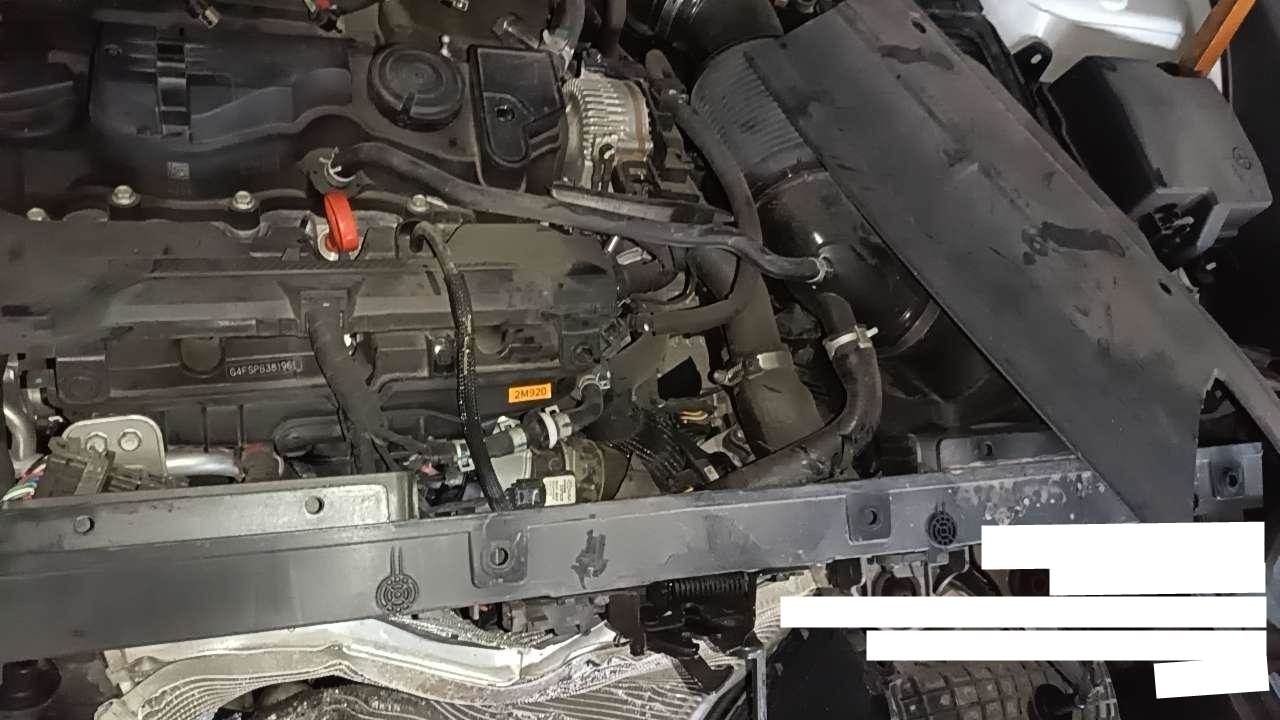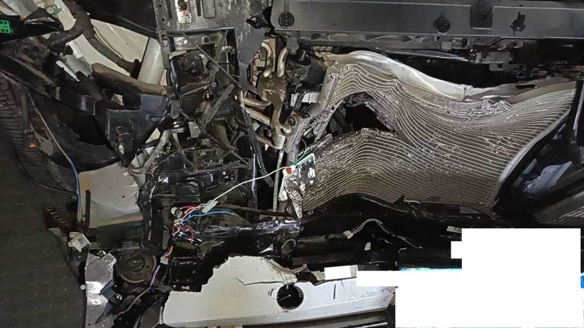 前部受损,爆气囊,右前纵梁变形,发动机后移(部分附件受损),已拆检,底盘隐损待定