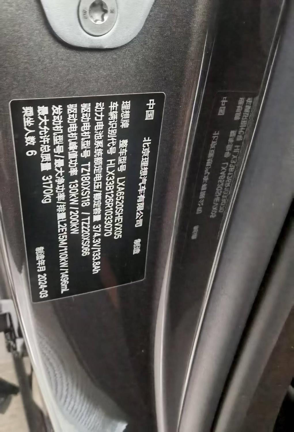 初次登记日期 2024-03-15 车辆名称 理想汽车