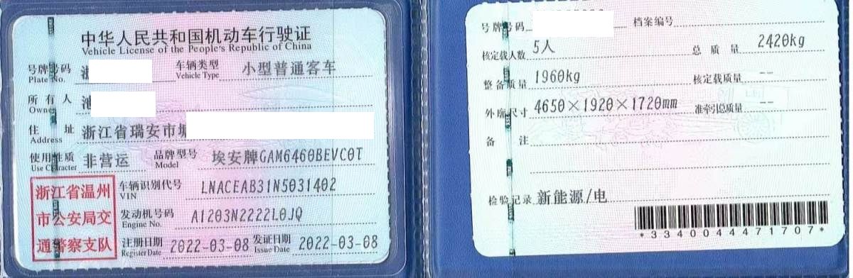 初次登记日期 2022-03-08 车辆名称 埃安 AION