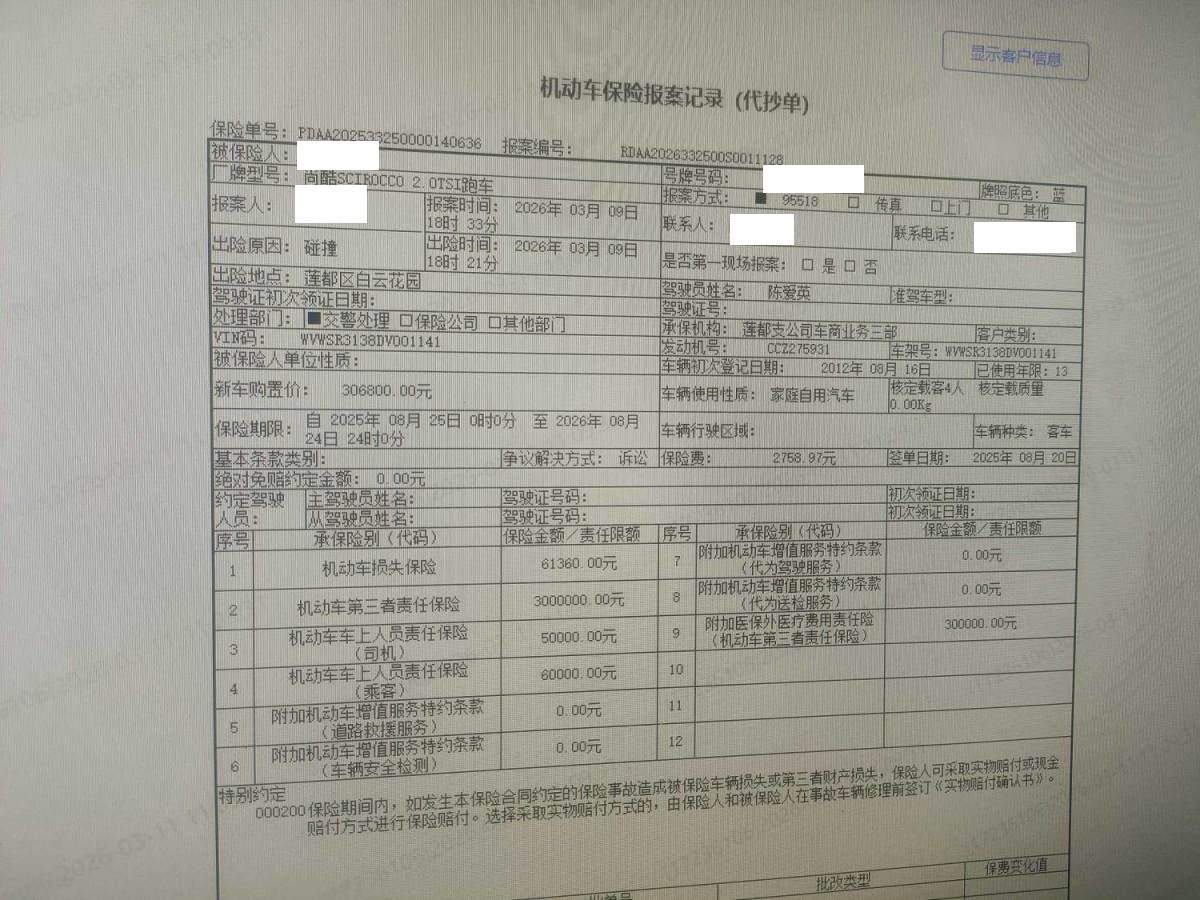 保险金额 ¥61360 预估维修金额 30000