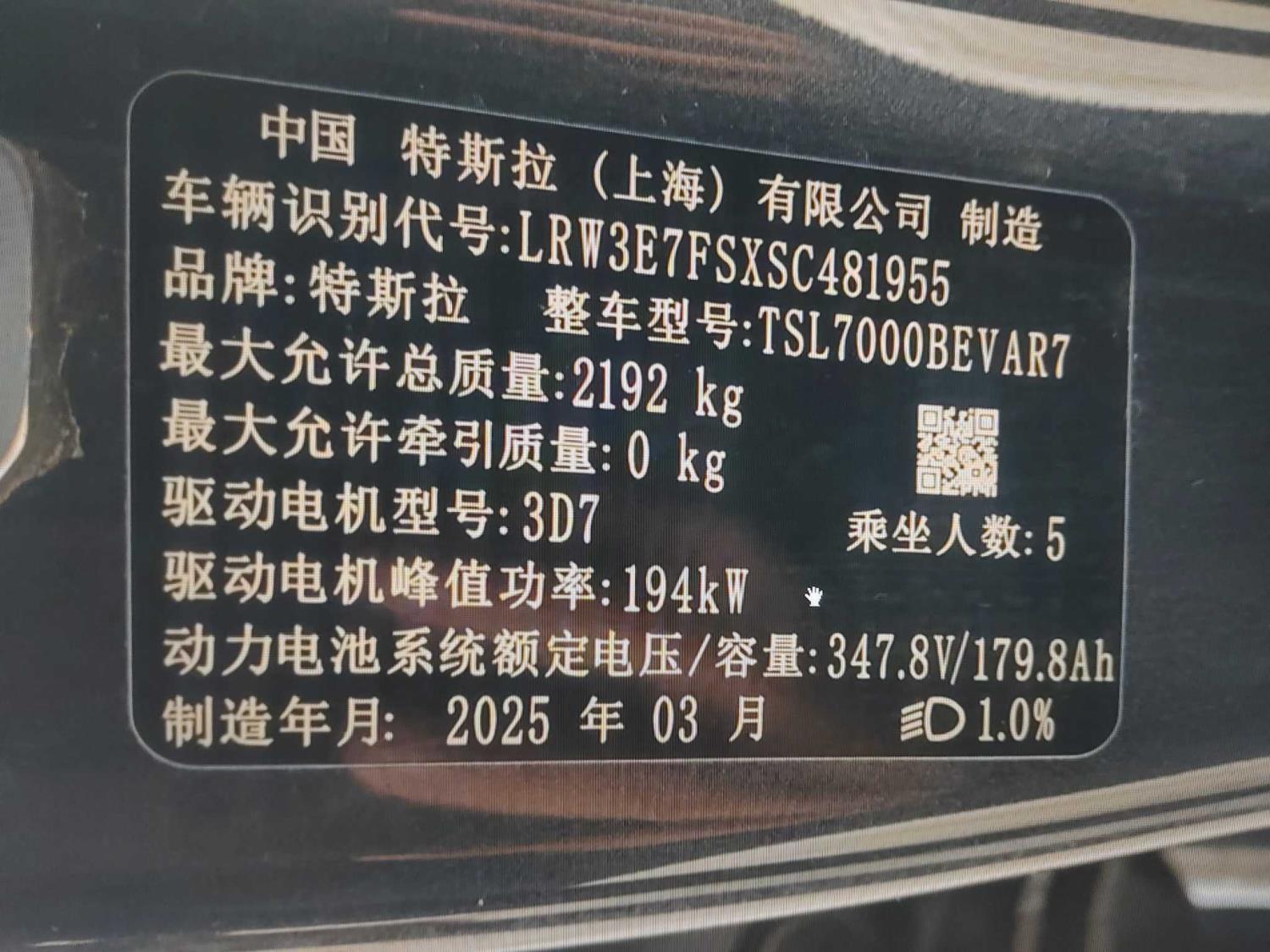 初次登记日期 2025-03-24 车辆名称 特斯拉 Model