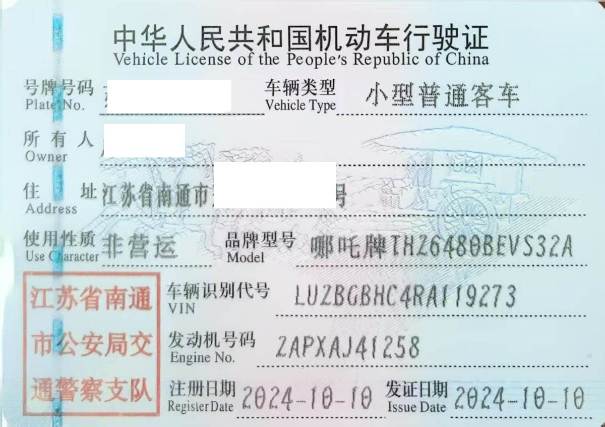 初次登记日期 2024-10-10 车辆名称 哪吒汽车 哪吒
