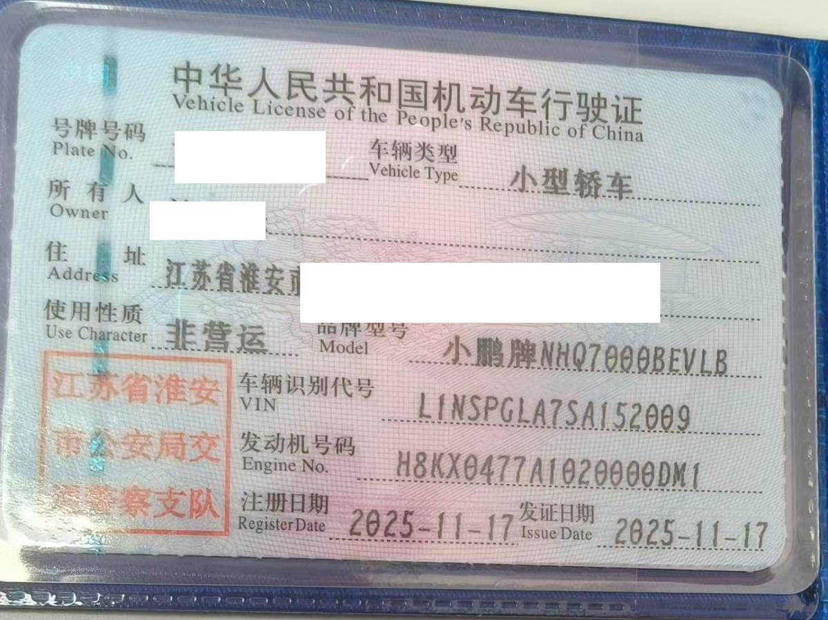 初次登记日期 2025-11-17 车辆名称 小鹏牌