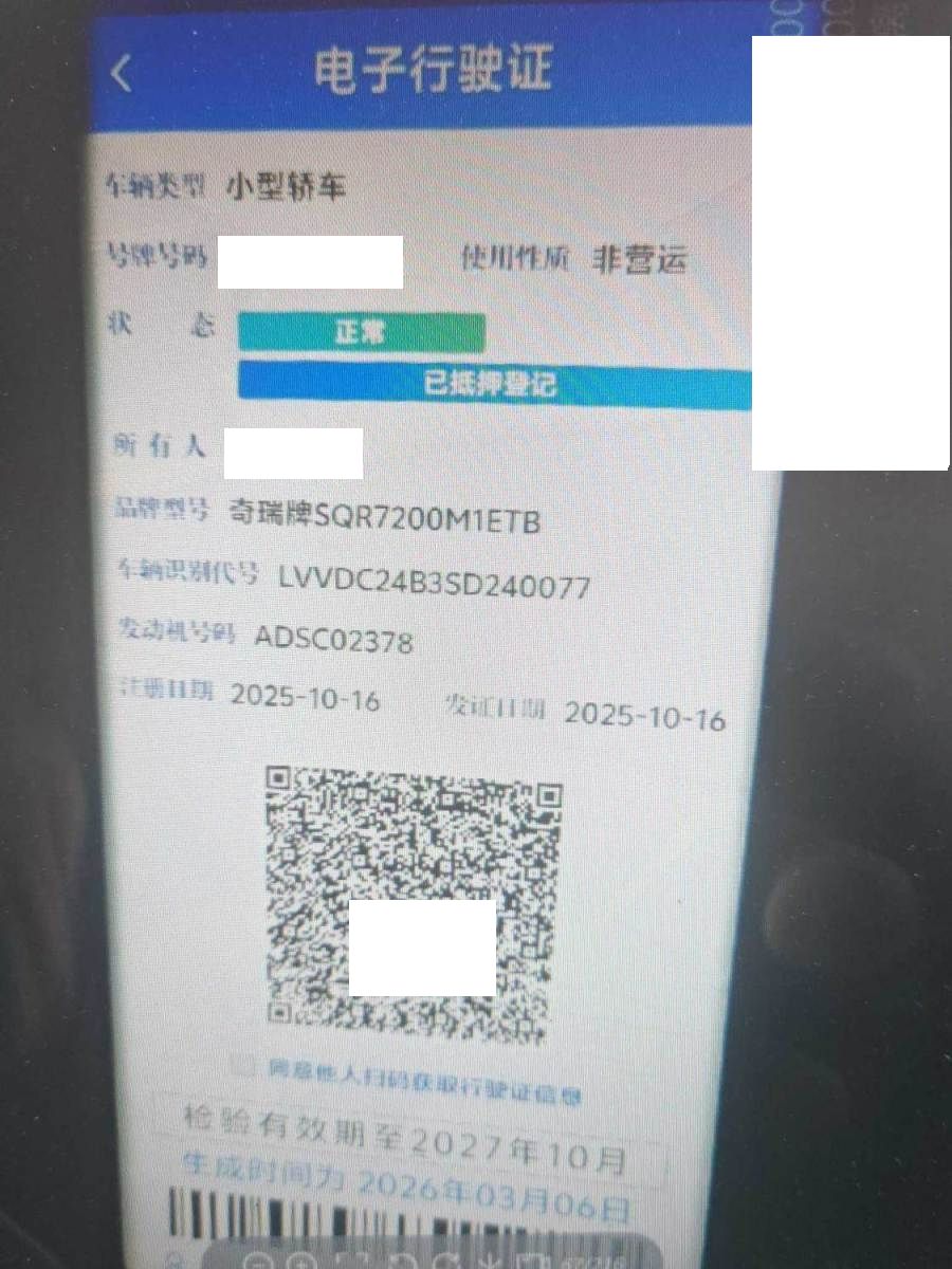 初次登记日期 2025-10-16 车辆名称 奇瑞牌