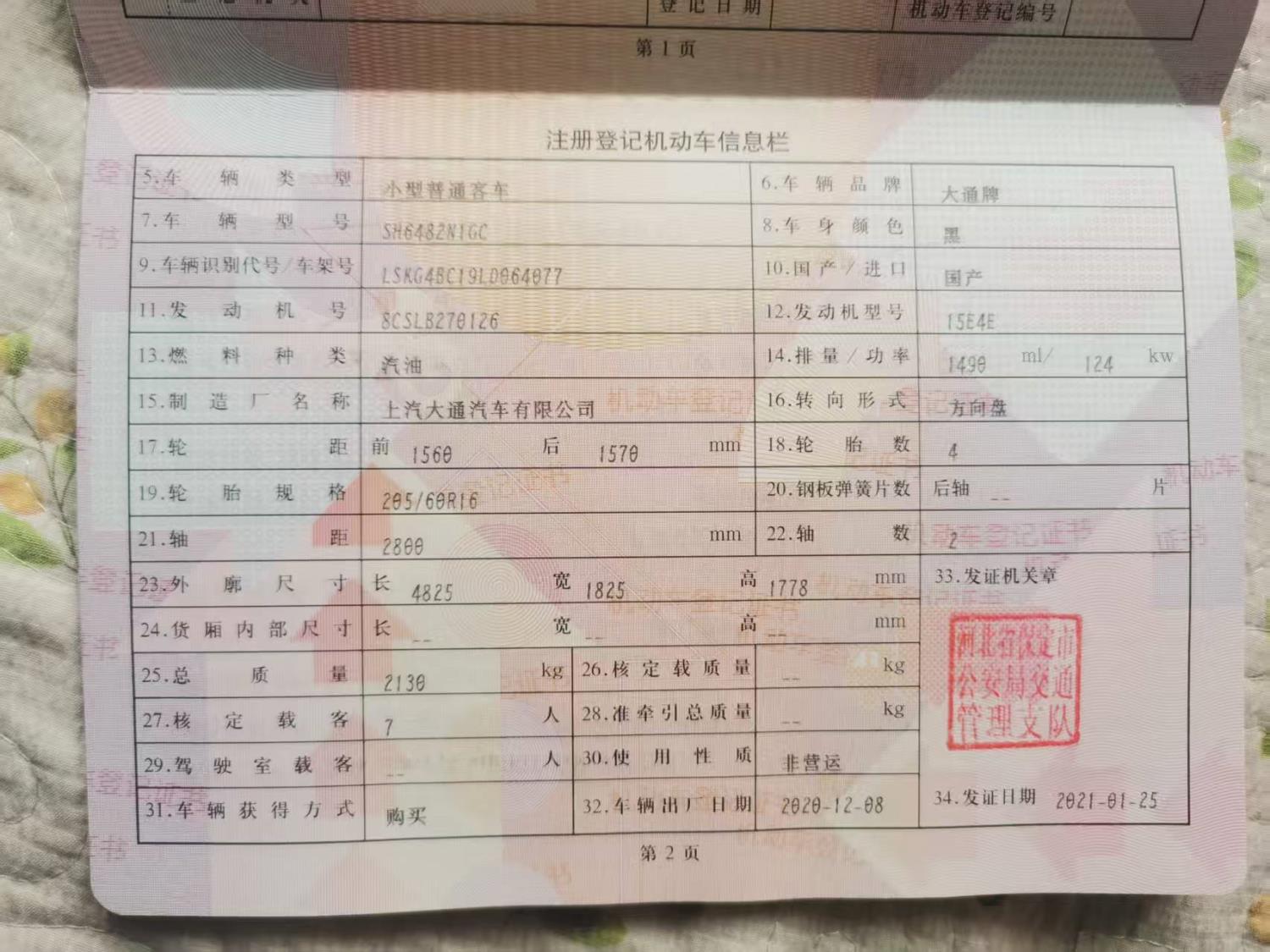 初次登记日期 2021-01-25 车辆名称 大通G50