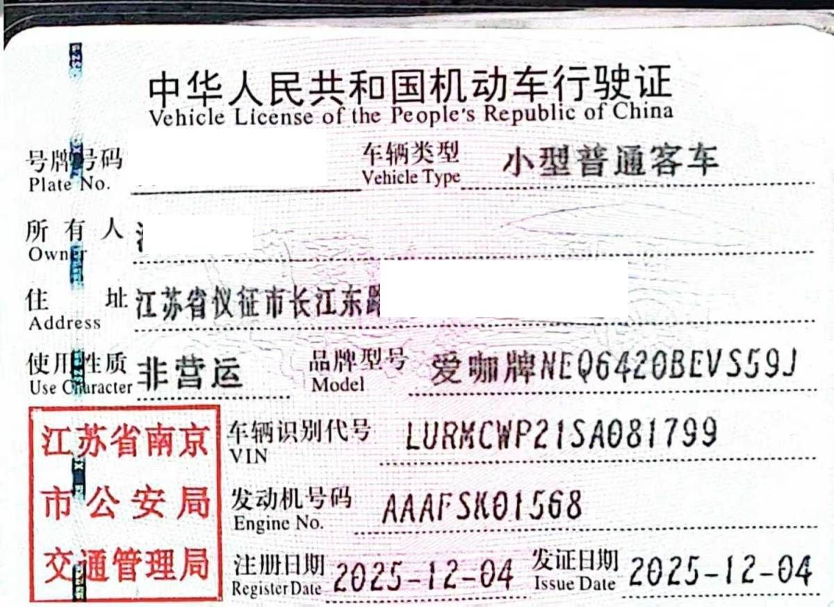 初次登记日期 2025-12-04 车辆名称 iCAR