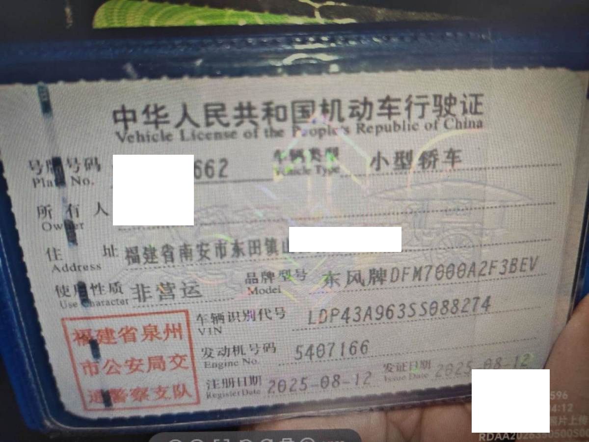 初次登记日期 2025-08-12 车辆名称 东风奕派