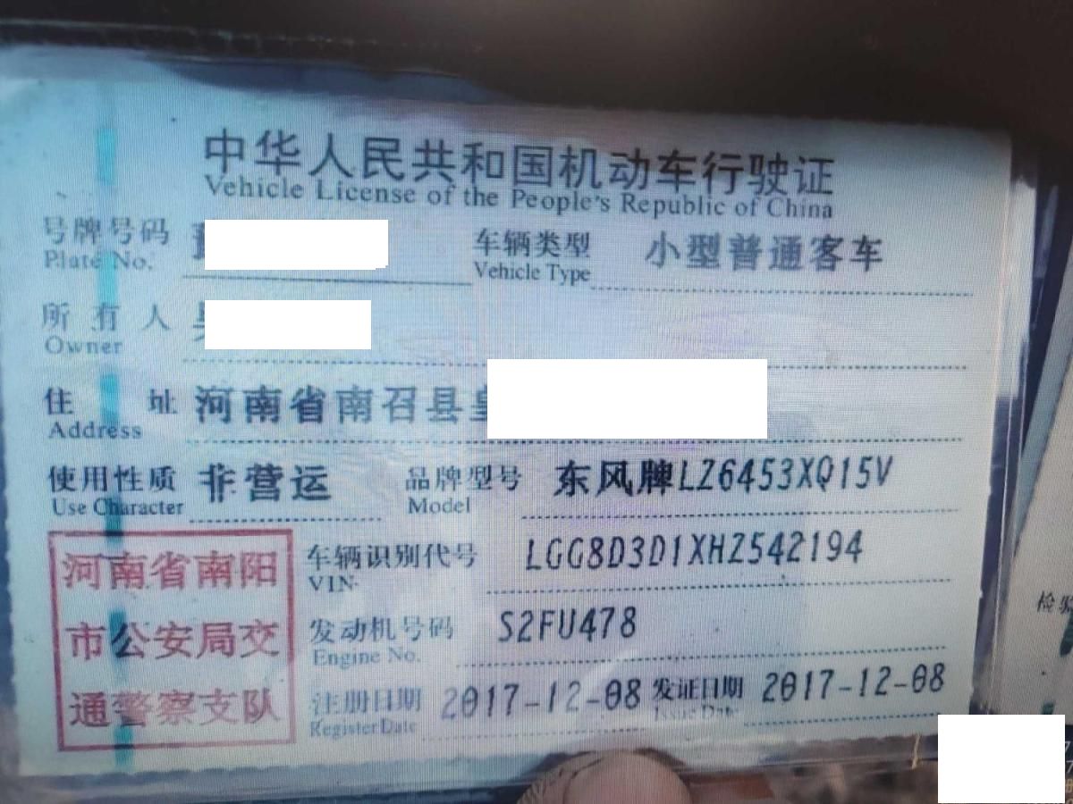初次登记日期 2017-12-08 车辆名称 东风风行 景逸X5