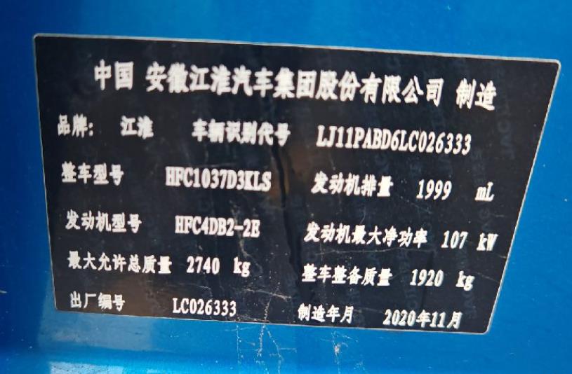 初次登记日期 2021-10-08 车辆名称 江汽集团 江淮T6