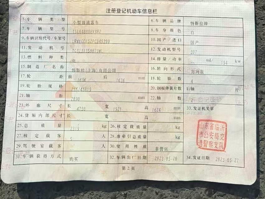初次登记日期 2023-05-27 车辆名称 特斯拉 Model