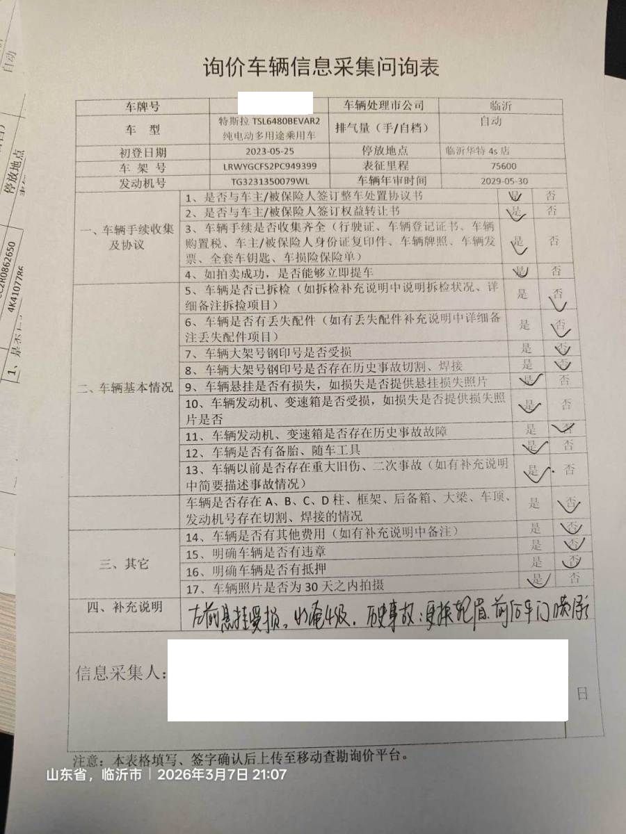 车架号是否受损 未知 使用性质 非营运