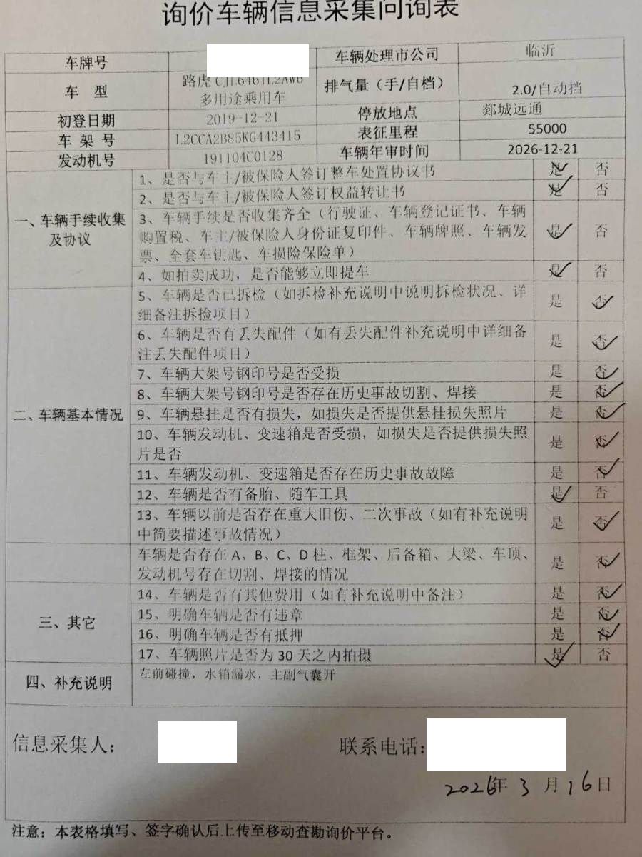 车架号是否受损 未知 使用性质 非营运