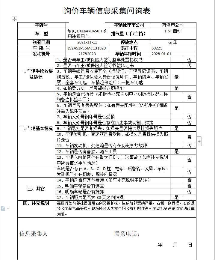 车架号是否受损 未知 使用性质 非营运