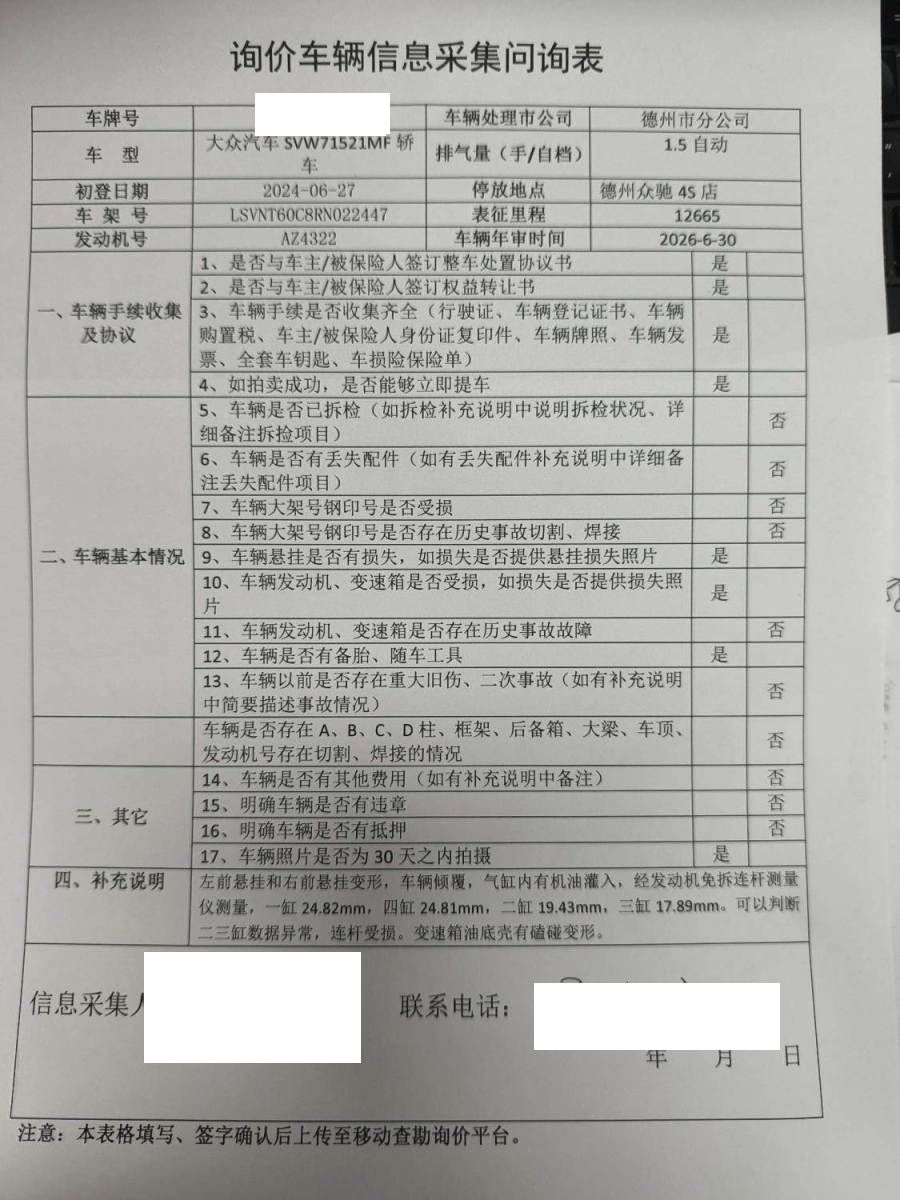 车架号是否受损 未知 使用性质 非营运
