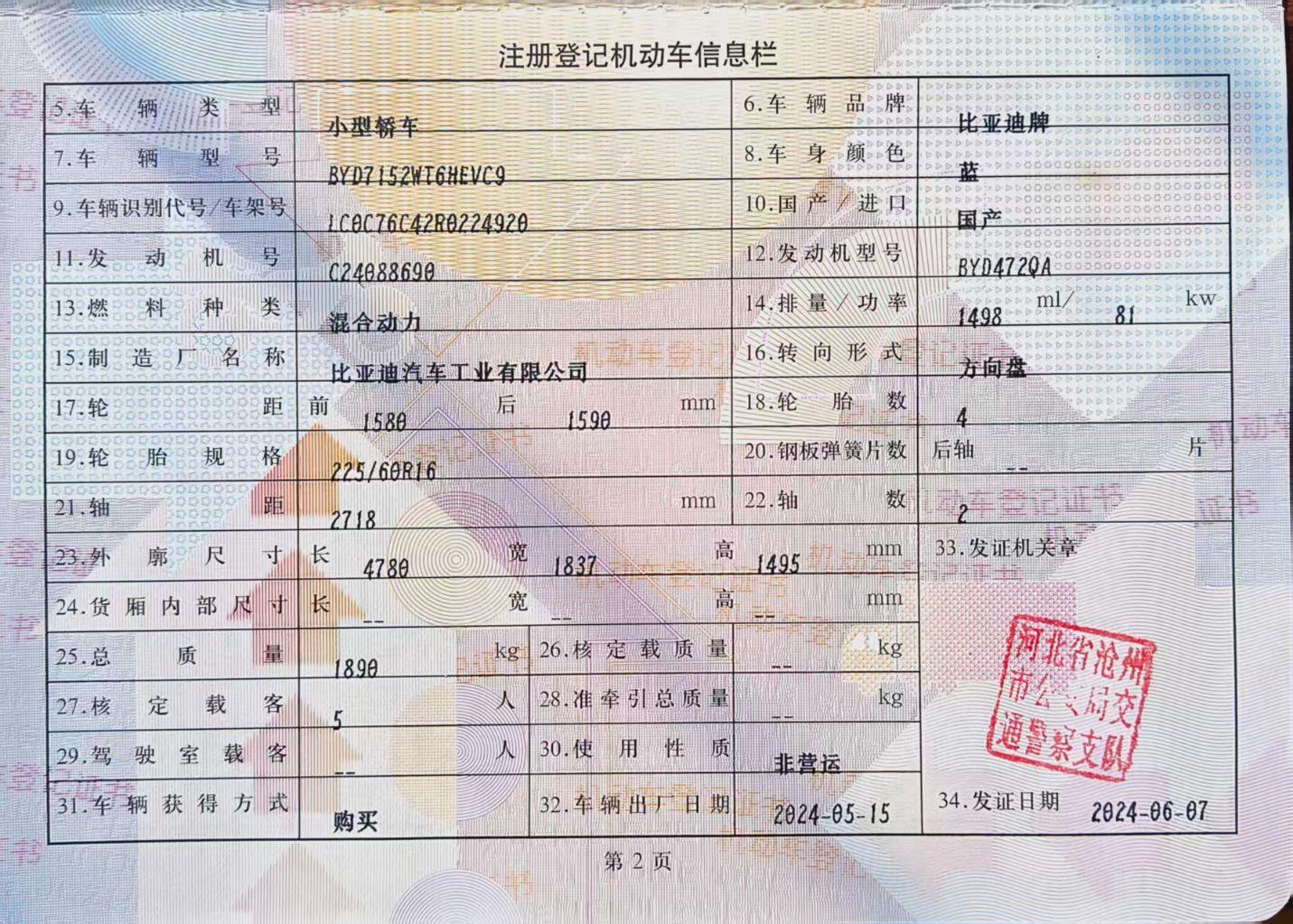 初次登记日期 2024-06-07 车辆名称 比亚迪 驱逐舰