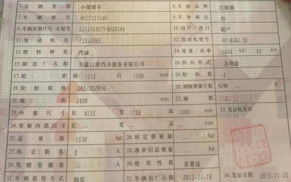 初次登记日期 2015-11-25 车辆名称 江汽集团 瑞风S2