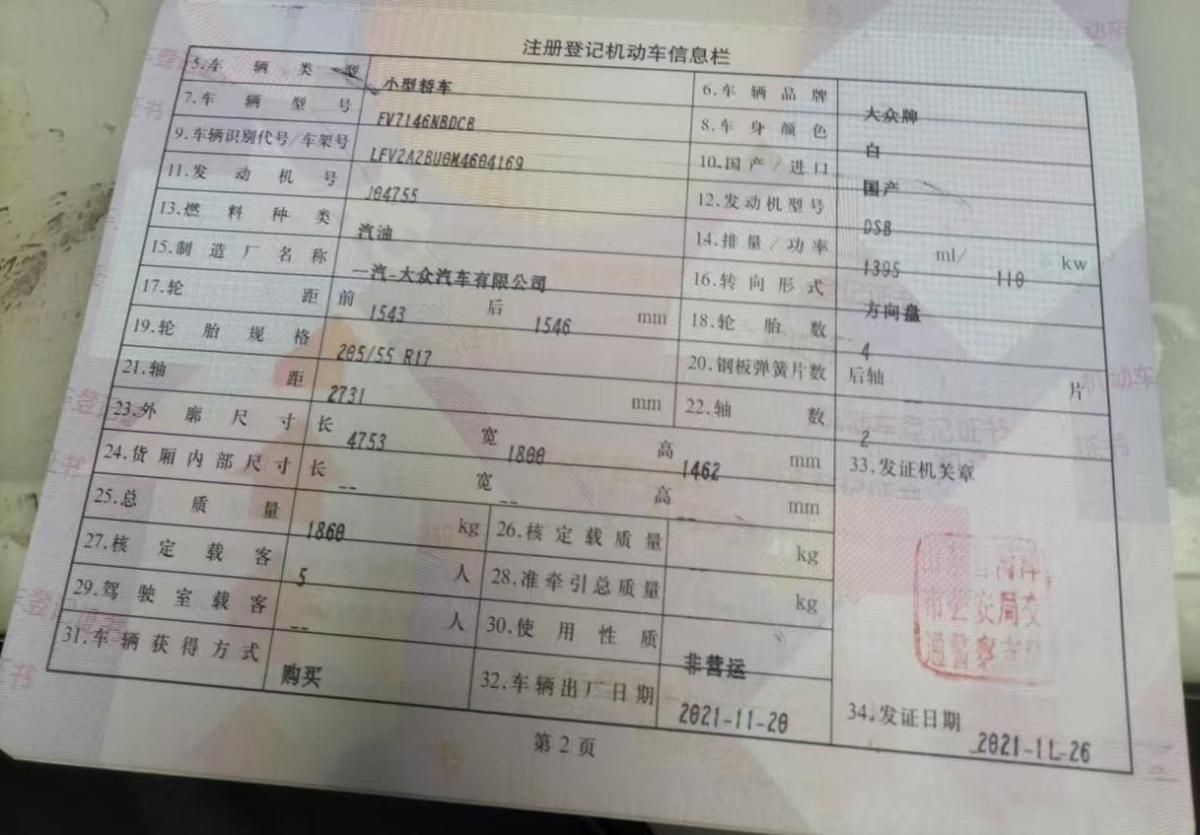 初次登记日期 2021-11-26 车辆名称 大众 速腾
