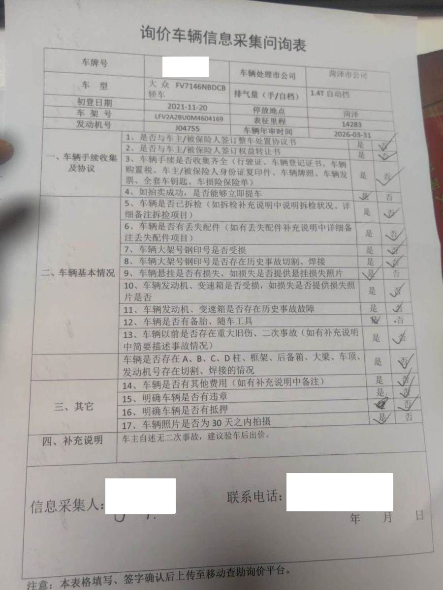 车架号是否受损 未知 使用性质 非营运
