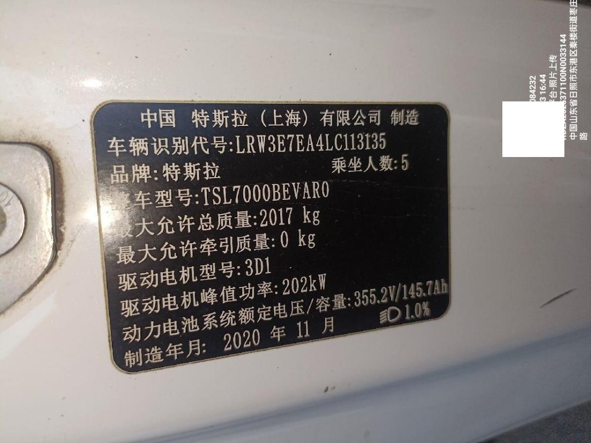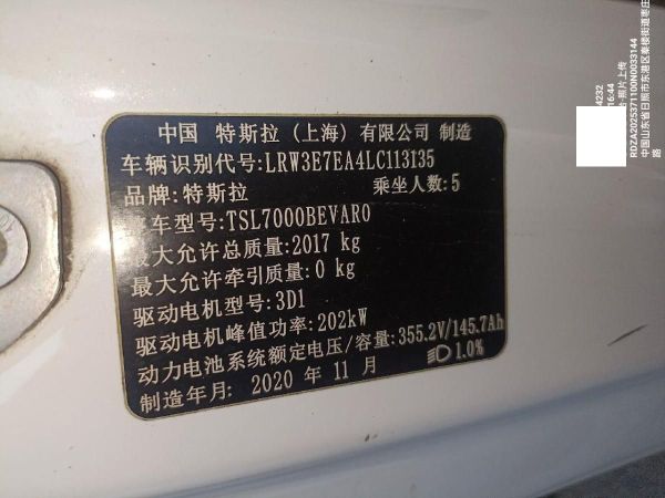 初次登记日期 2020-11-26 车辆名称 特斯拉 Model