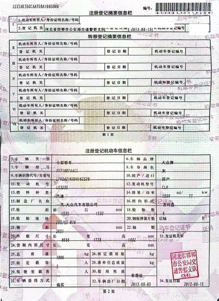 初次登记日期 2013-08-15 车辆名称 大众 速腾