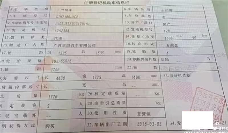 车牌号 冀****** 品牌 丰田