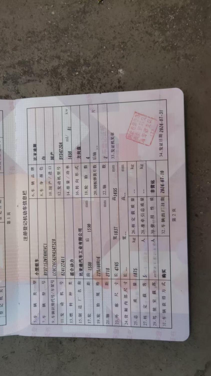 初次登记日期 2024-07-31 车辆名称 比亚迪 秦PLUS