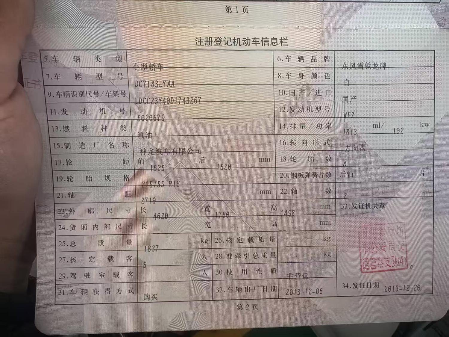 初次登记日期 2013-12-20 车辆名称 雪铁龙C4L