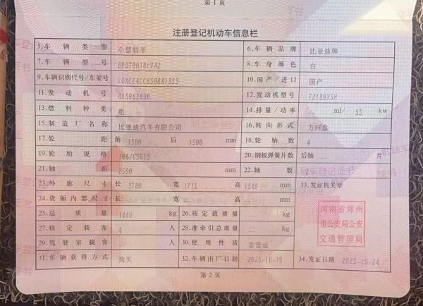初次登记日期 2025-10-24 车辆名称 比亚迪 海鸥