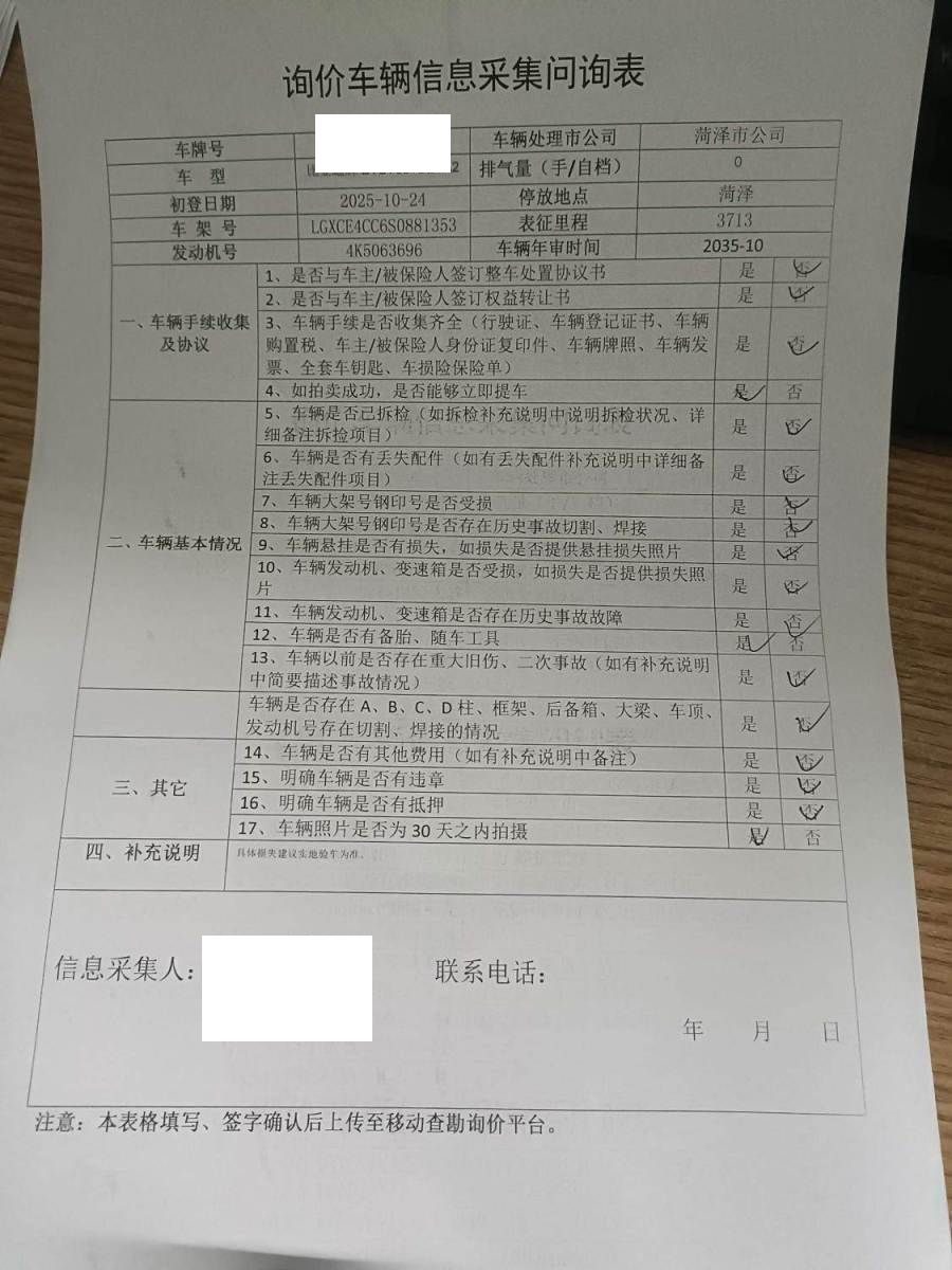 车架号是否受损 未知 使用性质 非营运